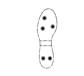 - DM0000: THE MARK CONSISTS OF AN OUTLINE OF THE SOLE OF A SHOE INSIDE OF WHICH TWO HORIZONTAL LINES DELINEATE TOE AND HEEL AREAS RESPECTIVELY AND IN WHICH THREE TRIANGULARLY ARRANGED DOTS APPEAR IN THE TOE AREA AND TWO HORIZONTALLY ARRANGED DOTS APPEAR IN THE HEEL AREA. THE DOTS CONSIST OF TWO CONCENTRIC CIRCLES, THE INNER CIRCLES BEING OF A SOLID COLOR.