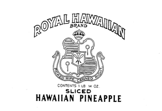 ROYAL HAWAIIAN BRAND PICKED RIPE, CANNED RIGHT. CONTENTS 1 LB 14 OZ. SLICED HAWAIIAN PINEAPPLE