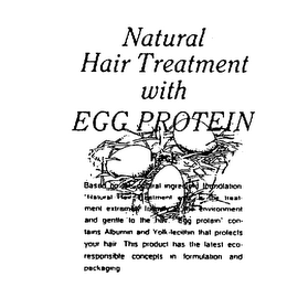NATURAL HAIR TREATMENT WITH EGG PROTEIN PACK BASED ON THE NATURAL INGREDIENT FORMULATION. "NATURAL HAIR TREATMENT WITH" IS THE TREATMENT EXTREMELY FRIENDLY TO THE ENVIRONMENT AND GENTLE TO THE HAIR. "EGG PROTEIN" CONTAINS ALBUMIN AND YOLK-LECITHIN THAT PROTECTS YOUR HAIR. THIS PRODUCT HAS THE LATEST ECO-RESPONSIBLE CONCEPTS IN FORMULATION AND PACKAGING.