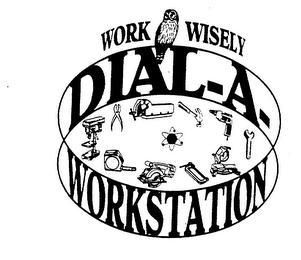 DM0000: The mark consists of the wording "Work Wisely" with an owl design, and the wording "Dial-A-Workstation" in a circular design which surrounds the designs of a variety of tools, lab equipment, and an atomic symbol.