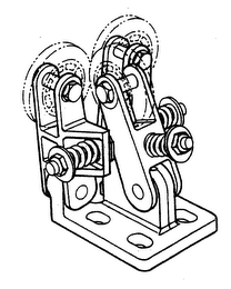 - DM0000: The mark consists of the three-dimensional configuration of roller guides. The roller guide includes three main components: the base, three pivot arms and the distinctive spring and bolt assemblies. All three pivot arms consist of two parallel surfaces of generally elongated oval shapes. The two "side" pivot arms are distinctive by the tabs that protrude from their sides. The two side pivot arms extend outwardly in a substantially V-shaped configuration from lugs cast into the base casting. The third "face" pivot arm forms an acute angle with the base and extends upwardly from a third lug on the base and bisects the V-shaped configuration formed by the other two pivot arms. Two of the spring and bolt assemblies extend in opposite directions from each other and extend substantially parallel to the base. They are attached to a large ridge-like portion of the base. The third spring and bolt assembly forms an acute angle with the base and a 90-degree angle with the face pivot arm. The base includes a substantially planar platform that has three lugs for attaching the pivot arms, as well as a large central ridge. The wheels depicted by dotted lines do not form any part of the mark in this application.