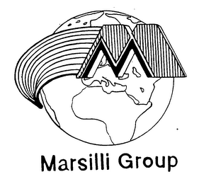 - DM0000: The words 'Marsilli Group' appear in black. The stylized letter M is grey. The shadowing beneath the letter M is black. The areas above and to the left and right of the grey letter M, are in red. The area between the grey letter M and the red areas is black. The stylized planet earth is in light blue with the continents in beige at the top of the planet and gradually darkening to brown at the bottom of the planet. The band partially covering the planet is brick red with a series of parallel black segments. The entire mark is presented on a white background.