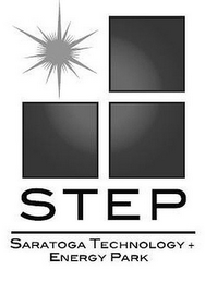 DM0000: The mark consists of starburst in upper left-hand corner with three squares to the right and below starburst with word "STEP" underlined beneath two boxes and "SARATOGA TECHNOLOGY + "placed beneath the underline and "ENERGY PARK" placed beneath "SARATOGA TECHNOLOGY +".