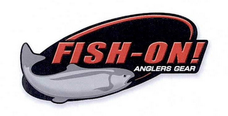 - DM0000: The mark consists of the color red appears in the wording "FISH-ON!"' and in an arc above the wording; the color white appears in the wording "ANGLER'S GEAR"; the color gray appears in the design of a fish; and the color black appears in an oval background behind the wording and design.