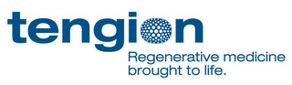 DM0000: The mark consists of the term "TENGION", presented in a stylized form wherein the letter "o" contains a design representing a cell culture, and the phrase "REGENERATIVE MEDICINE BROUGHT TO LIFE.". The entire mark is displayed in the color blue.