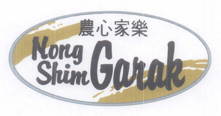 - DM0000: The mark consists of four Chinese characters and the stylized word "NONG SHIM GARAK" which is arranged so that the word "NONG" is above the word "SHIM" which both appear to the left of the word "GARAK" and with the Chinese characters primarily appearing above the word "GARAK", all within a horizontally oriented white oval containing green shading in the upper left and lower right areas of the oval. The letters and Chinese characters are black. The oval is surrounded by a silver border.