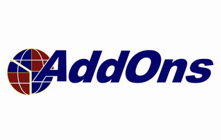 - DM0000: The mark consists of the word "ADDONS" located to the left of a round orb divided into four quadrants. The color blue appears in the literal element, "ADDONS", and in the round orb deign element. The color red appears in the round orb design element. The color yellow appears in the round orb design element, outlining the orb and its quadrants. The color white constitutes background or transparent areas, and is not part of the mark.
