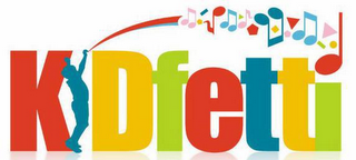 - DM0000: The mark consists of the word "kidfetti" wherein the letter "K" (red) is capitalized, the first letter "i" is a child (blue) throwing a rainbow of geometric shapes and music notes (red, blue, green, yellow, pink) over the reamining letters "D" (capitilized,yellow), "f" (green), "e" (red), "t" (blue), "t" (yellow) and "i" (green) dotted with a music note (red).
