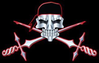 - DM0000: The mark consists of a distinctive skull design in silver color, with black eyes, a black bandana outlined in red, and two crossed swords in silver color outlined in red. The black background is not claimed as a feature of the mark.