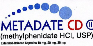 DM0000: The mark consists of "METADATE CD" followed by an uppercase "C" enclosing the roman numeral "II". The second line reads "(methylphenidate HCl, USP)". The third line reads "Extended-Release Capsules 10 mg, 20 mg, 30 mg". Directly above the first line is a dot pattern of circles gradually becoming larger as they arch to the right. Blue, red and black are claimed as a feature of the mark. A gradation of the color blue appears in the circles; the color blue appears in the wording "METADATE" and in the letter "C" with the Roman numeral "II" within it; the color red appears in the wording "CD"; and the color black appears in the wording "(methylphenidate HCl, USP)" and "Extended-Release Capsules 10 mg, 20 mg, 30 mg".