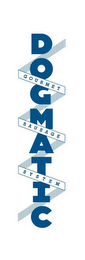 DM0000: The mark consists of the word "DOGMATIC"written vertically in blue having a white banner running down the word "DOGMATIC" on which the words "GOURMET SAUSAGE SYSTEM" are written in blue.