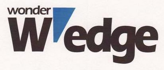 - DM0000: The mark consists of the wording "WONDER WEDGE" in the color black overlaying a white background. The word "WONDER" is entirely on top of the letter "W" in "WEDGE". A blue triangle design element is between the letters "W" and "E" in the word "WEDGE".
