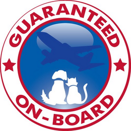 - DM0000: The mark consists of a silhouette-like image of a dog and a cat (in the color white) below the image of an airplane (in the color dark blue) all on a circular background of lighter blue within a red circle; on the outside of such red circle and within a second concentric red circle are the words "GUARANTEED ON-BOARD" (in the color red) and two red five-pointed stars.