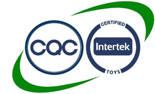 DM0000: The mark consists of the letters "CQC" in blue circumscribed by a blue circle, alongside the word "Intertek" in white within a blue rectangular shape circumscribed by a blue circle into which the words "Certified Toys" are integrated. Two green swooping shapes appear to the upper right and lower left of the two circles forming an oval .