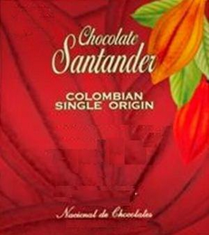DM0000: The mark consists of the words "CHOCOLATE SANTANDER COLOMBIAN SINGLE ORIGIN NACIONAL DE CHOCOLATES". In the upper right corner of the mark appear four leaves. In the background appear images of leaves. The color white appears in the words "CHOCOLATE SANTANDER COLOMBIAN SINGLE ORIGIN NACIONAL DE CHOCOLATES". The color red appears in the background and in the leaves. The colors orange and green appear in the leaves that appear in the upper right hand corner of the mark.