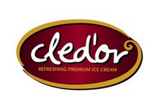 - DM0000: The mark consists of the wording "CLÉD'OR" in white with black accents above the wording "REFRESHING PREMIUM ICE CREAM" in gold; the wording is on a red background within an oval outlined in gold with black accents
