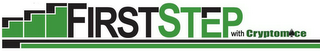 DM0000: The mark consists of three rectangles divided into two sections the bottom in green and the top in black ascending in height to the right with tallest next to the wording "FIRSTSTEP", with the word "first" in black and the word "step" in green and with the top of the letter "E" appearing in black, to the left of the wording "WITH CRYPTOMACE", with the word "with" appearing in black and the word "cryptomace" appearing predominantly in green with a black spade forming the letter "A", and with all design and wording underlined with a black over green underlining.