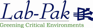 DM0000: The mark consists of "Lab-Pak" is written in blue BernhardMod BT font. There is a blue box to the right of the "Lab-Pak" text, which has three arrows going through it and bending in different directions to symbolize air flow. There is a blue line under "Lab-Pak" text, and "Greening Critical Environments" is written under the line in green.