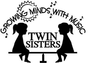 DM0000: The mark consists of Silhouette of two girls on a see-saw beneath an outline of a sun and musical notes. The words GROWING MINDS WITH MUSIC intersect the sun. The words TWIN SISTERS appear between the two girls.