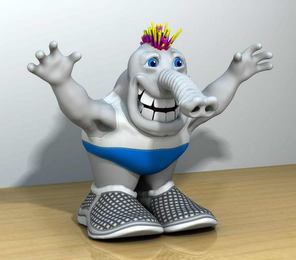 - CD0000: GRAPHIC DESIGN OF CHARACTER, GREY IN COLOR WITH BLUE EYES, PINK AND YELLOW MOHAWK HAIRSTYLE, TEETH, HUMAN-like FOUR-DIGIT HANDS, ELEPHANT-LIKE NOSE, WEARING BLUE AND WHITE SWIMSUIT, AND SHOES WITH GREY AND WHITE CHECKED PATTERN.