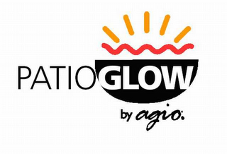 - CD0000: The mark consists of The word "PATIO" written in black letters followed by the word "GLOW" written in white letters enclosed within a black upward-facing semi-circle with an orangish-red wavy line running horizontally above the semi-circle. Above the wavy line are five yellowish-orange lines arranged in an arch formation. Below the black semi-circle are the words "by agio". written in black letters, the word "agio". in cursive.
