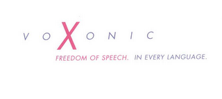 CD0000: The mark consists of VOXONIC with a stylized X in the color red, the wording "Freedom of Speech" in the color red, and the wording "In Every Language" and the letters VO ONIC in black.