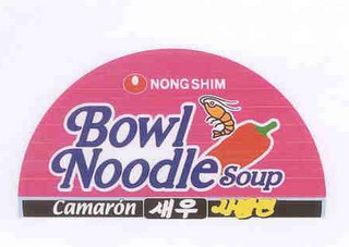 CD0000: The mark consists of the words NONG SHIM BOWL NOODLE SOUP CAMARON and Korean characters on a fuchsia colored half circle and a black horizontal strip at the bottom of the half circle. A narrow horizontal turquoise strip appears between the fuchsia colored half circle and the black horizontal strip. The black horizontal strip contains the word "Camaron" and two sets of non-Latin characters. The word "Camaron" and the first set of non-Latin characters are white and the second set of non-Latin characters is yellow. A red circular symbol with a centrally located white colored teardrop and a white outline appears towards the top of the mark and the words "NONG SHIM" appear in white to the right of said symbol. The words "BOWL NOODLE SOUP" appear in blue stylized print on two vertically stacked lines, as follows: the word "Bowl" is on the first line, while the words "Noodle Soup" are on the second line. The word "Soup" appears in smaller print than the words "Bowl Noodle". To the right of these words is an orange colored shrimp sitting atop a red pepper with a green stem.