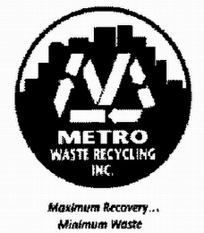 DM0000: The mark consists of a circle containing a skyline, letter "M" formed with arrows and bars, the words "Metro Waste Recycling Inc." and the words "Maximum Recovery...Minimum Waste" under the circle.