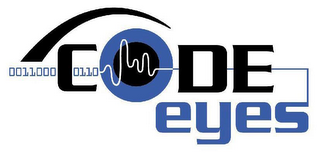 - CD0000: The mark consists of the word "code" in all capital letters, black color and a stylized "O" that is a blue circle surrounds a solid black circle and a wavy white line of varing height runs through the middle. The word "eyes" in all lower case, blue in color is below the word "CODE" and begins between the O and D. The wavy line from the O in CODE turns blue in color when it leaves the O and is a straight line that runs to the right beyond the E in CODE and then runs down into the top of the s in eyes. There is a solid black arch from the left of the C in CODE that goes over the C and the O and is designed to look like an eyebrow. There are two zeros followed by two ones followed by three zeros in solid blue to the left of the C in Code and one zero followed by two ones followed by one zero in solid blue in the middle of the C in the word CODE.