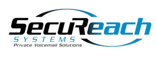 CD0000: The mark consists of 2 curved lines with black on the left and blue on the right. One line above and one line below and to the right of SecuReach. SecuReach is black on the left turning to blue on the right. Beneath this is Systems in all caps and blue. Beneath SYSTEMS is Private Voicemail Solutions in black.