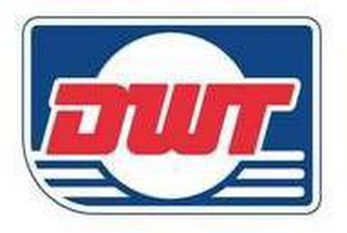 - DM0000: The mark consists of a blue rectangular logo with a rounded bottom left corner, having a white circle centered within the rectangle, with three white horizontal lines extending outward horizontally from the bottom third portion of the circle in both directions. The stylized letters DWT are in red with a thin white outline, and are imposed over the circle centered within the rectangle. The blue rectangular design has an outline comprised of a white inner portion and a thin blue outer portion.