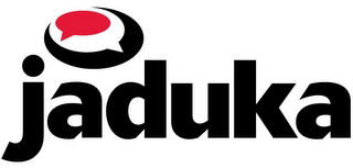 - CD0000: The color black appears in the word JADUKA and in the oval design element. The color white appears in the larger speech balloon and the color red appears in the smaller speech balloon in the design element.