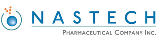 DM0000: The mark consists of a solid circular sphere colored blue with white shading within an incomplete single line circle colored green, and an arrow formed by five circles all colored orange. The wording "NASTECH" is colored blue and placed above a green horizontal line, and the wording "PHARMACEUTICAL COMPANY INC." is colored gray and placed below the green horizontal line.