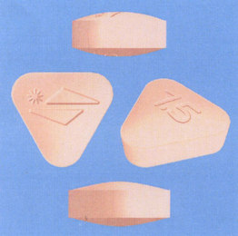 - DM0000: This three-dimensional pill, presented in four different views, is characterized by its color (Pantone n°474), its triangular shape with rounded ends, the engraving, on one side, of a logo representing a nine-tipped star and two triangles and, on the other side, the number 7.5.