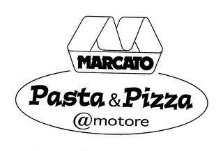 DM0000: The mark comprises the representation of the letter "M" closed at its base by a ribbon conveniently folded so as to form a figure similar to a lasagna and with, in the area of its base, the word "MARCATO" in uppercase font and an ellipse in which there are the words "PASTA" with an initial capital letter, the commercial symbol "&" as a conjunction, the word "PIZZA" with an initial capital letter, the symbol @ followed with no space by the word "MOTORE" written in lowercase font.