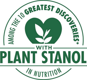 DM0000: The mark consists of a green single line circle design with the wording "AMONG THE 10 GREATEST DISCOVERIES IN NUTRITION" wrapping around the interior in green lettering. A green heart design with a white plant on it are in the center of the circle and the wording "WITH PLANT STANOL" is below the heart in green lettering with a green underline and overline that cuts through the circle design.