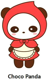 - CD0000: The panda's cloak and skirt are in red, the panda's apron is in Beige, the panda's face is in ivory, the panda's ear, nose, arms and legs are in brown, the panda's eye is in brown and ivory, the panda's cheek is in pink, the words "Choco Panda" are in black.