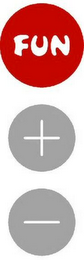 - DM0000: The mark consists of three circles stacked in a column, with the top circle is red and contains the wording "FUN" in stylized white lettering, the middle circle in champagne and contains a white plus sign, and the bottom circle is campagne and contains a white minus sign. The background which appears white and champagne is not claimed as a feature of the mark.