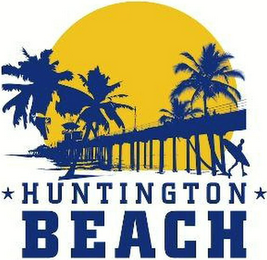- DM0000: The mark consists of the stylized wording "HUNTINGTON BEACH" with the word "HUNTINGTON" appearing in dark blue with two dark blue stars on either side of the word and the term "BEACH" in blue and a design of a pier in blue with blue palm trees, a yellow sunset and a silhouette of a person carrying a surf board in blue. Two dark blue stars appear on either side of the word "HUNTINGTON". The white in the mark represents background is not claimed as a feature of the mark.