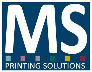 - DM0000: The mark consists of The letters "MS" in the color white above the wording "PRINTING SOLUTIONS" in white separated by six squares in the colors turquoise, pink, grey, green, yellow and red all on a dark blue background.
