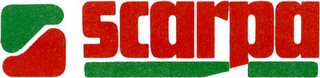 - DM0000: The mark consists of the word "scarpa" in stylized red letters with two straight and green horizontal bars appearing underneath and a stylized design of two polygon shapes appearing in red and green to the left of the word and all appearing on a white background.