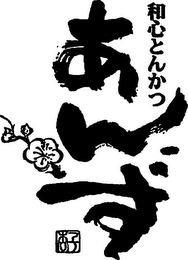 - DM0000: The mark consists of a small apricot flower design at the far left. This flower design is followed by a larger line of vertical Hiragana characters that transliterates to "ANZU" and a smaller line of vertical Kanji and Hiragana characters that transliterates to "WAGOKORO TONKATSU". Below it is a small box of horizontal characters that transliterate to "ANZU".