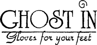 DM0000: The mark consists of the stylized wording "GHOST IN GLOVES FOR YOUR FEET" with spiral design. The stylized wording "GHOST IN" is underlined and it is featured above the stylized wording "GLOVES FOR YOUR FEET". A spiral design is featured as the tittle above the letter "I" in the word "IN".