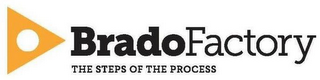 DM0000: The mark consists of the following: the stylized wording in black "BRADO FACTORY THE STEPS OF THE PROCESS" and the design of a light orange triangle with a circle in the center. The color white represents background and is not part of the mark.