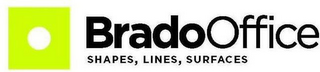 DM0000: The mark consists of the following: the stylized wording in black "BRADO OFFICE SHAPES, LINES, SURFACES" and the design of a lime green square with a circle in the center. The color white represents background and is not part of the mark.