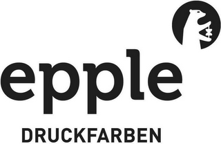 - DM0000: The mark consists of the word "EPPLE" in large stylized font, with the word "DRUCKFARBEN" below that in smaller stylized font, and with the design of a bear holding an ink ball in a shaded circle to the upper right of the wording.