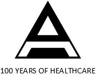 DM0000: The mark consist of a stylized lettter "A" composed of two concentric triangles in its upper half and a horizontal bar with opposite downwardly-extending legs in its lower half, all shown above the stylized wording "100 YEARS OF HEALTHCARE".