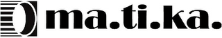 - DM0000: The mark consists of the following: a lined, black square with alternating white and black lines originating from the left which intersect with the left sides of two white concentric ovals disposed horizontally within the square. The wording "MA.TI.KA." appears in black to the right of the design. The remaining white is background and is not part of the mark.
