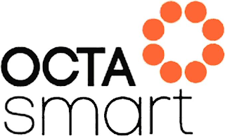- DM0000: The mark consists of the stacked, stylized wording "OCTA" and "SMART" in black and eight small orange circles forming the border to a larger unshaded circle to the right of the stylized wording.