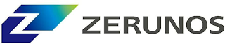 - DM0000: The mark consists of the stylized wording "ZERUNOS" in gray to the right of a design comprised of two polygons. The lower left polygon is blue. The upper right polygon appears in gradational colors, transitioning from blue at the leftmost areas to light blue, then blue-green, and finally to light green as it reaches the upper right corner of the polygon. The negative space between the two polygons forms a letter "Z".